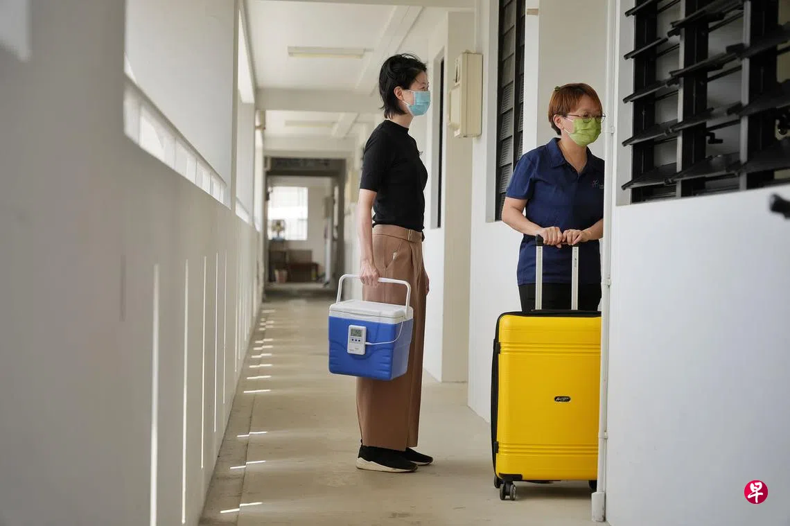 登门服务专业方便受惠者安心接种疫苗订户赠阅文章黄明慧医生(左)与护士蔡安喜是保健促进局登门疫苗接种团队的成员,她们昨天到实龙岗组屋为一名行动不便的年长者接种冠病疫苗。除了医疗器具,她们还带上存放疫苗的保冷箱(图中蓝色箱)。保冷箱设有温度监控器,确保疫苗维持在指定的温度范围内。(谢智扬摄)●冠病19疫情登门接种团队开始工作前,会到邻近的接种中心领取所需的疫苗剂量,储存在保冷箱。上门时,他们会检查受惠者的名字和身份证号码。医生也会检查对方的病历与健康状况,完成评估后,护士才可为对方注射疫苗。胡洁梅 报道保健促进局冠状病毒19上一篇榜鹅苏芒径组屋居民强制检测 不少送餐员和访客自愿受检下一篇特需者抗拒拭子检测 家属建议改用呼吸检测器减少恐惧购买此文章
