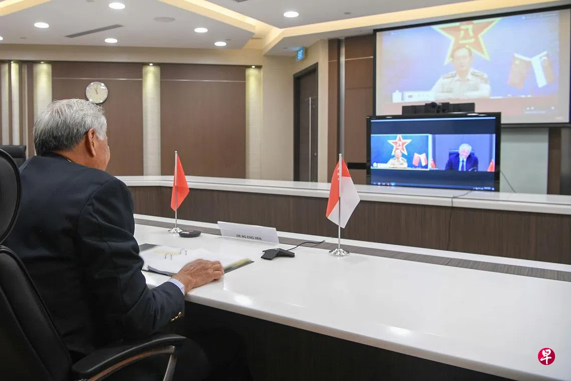 新中防长视讯讨论区域安全发展订户赠阅文章国防部长黄永宏透过视讯与中国防长魏凤和进行双边防务会谈,重申新中两国长期友好的防务关系。(国防部提供)黄伟曼 报道ngwaimun@sph.com.sg我国国防部长黄永宏医生昨天与中国防长魏凤和进行视讯会谈。新中两国防长讨论了区域安全发展,也探讨如何以实际方式加强亚细安—中国防务合作及现有区域防长会议机制,以加强军队之间的互信,避免冲突发生。魏凤和新中关系亚细安上一篇SMRT子公司与深圳地上铁合作 探讨可持续商业电动车方案下一篇卖人情给被拘留“网红主播” 警曹长一通电话毁20年生涯购买此文章
