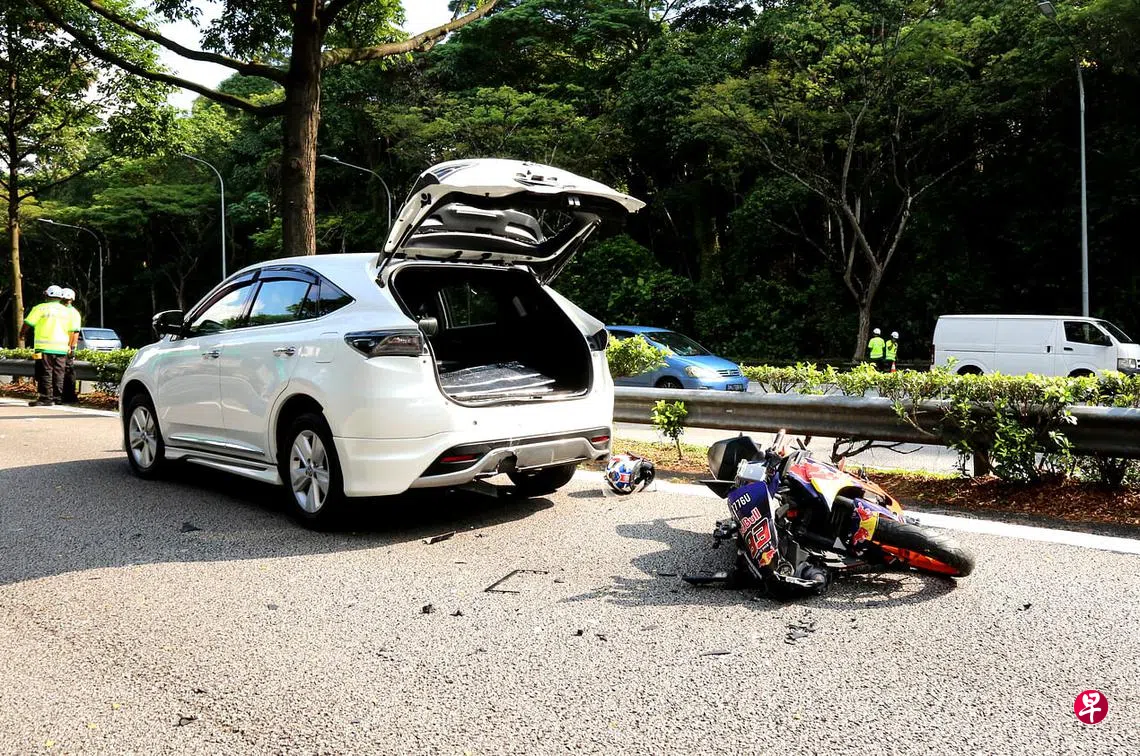 致命车祸发生在最右边车道,电单车骑士被撞飞到路中间的分界处,电单车则被抛到最左边的车道。一辆灰色汽车停在前方路旁,警员正向一名身穿蓝裙的女子问话。