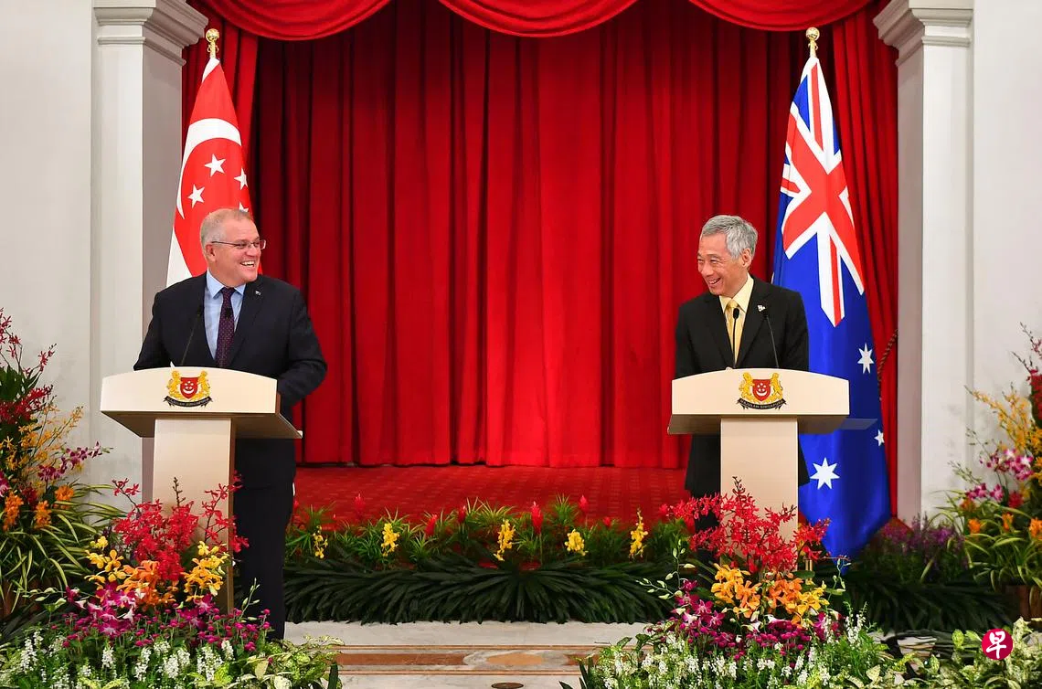 李显龙总理(右)昨天与来访的澳洲总理莫里森共同举行第六届新澳领袖级会议。李总理在会后的联合记者会上说,恢复双向旅行的基础在于互相承认双方的健康与疫苗接种证书,彼此的基础设施和程序得相应做好准备。