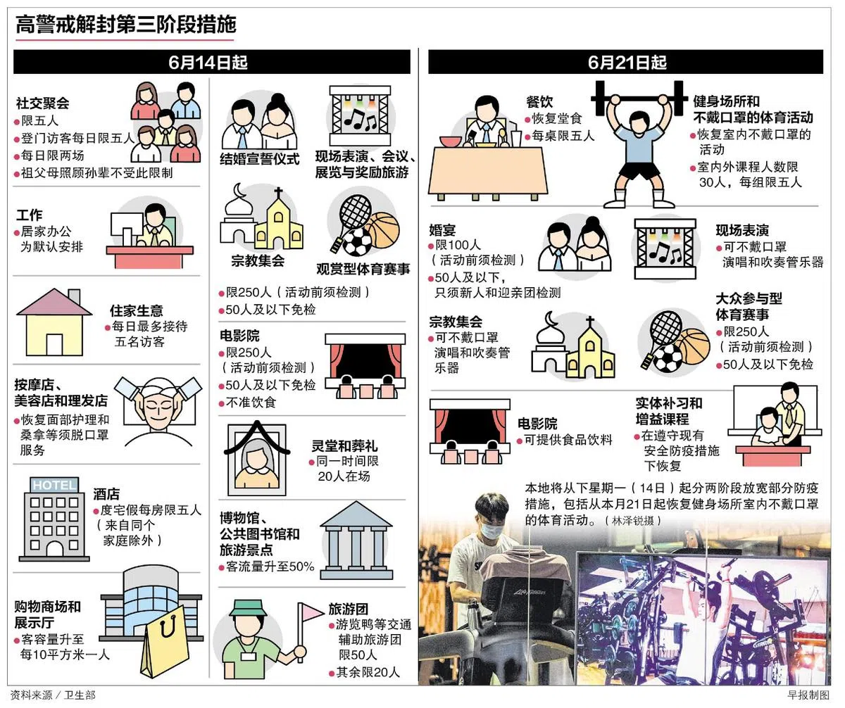 社区冠病传播情况改善,我国将分两个阶段放宽防疫措施。从下周一(14日)起,社交聚会和登门访客人数将从最多两人增至五人;若疫情持续受控,本月21日起,堂食等传播风险较高的活动将可恢复。