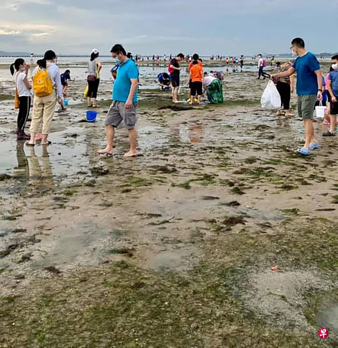 大批公众昨早前往樟宜海滩捡拾螃蟹、贝类和海葵等,海滩上人满为患。