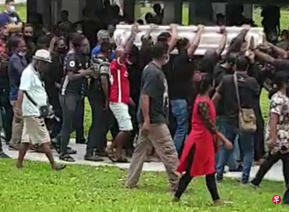 事后有多名公众发来上述送殡仪式的现场视频和照片给《联合早报》。根据视频,可看到约200人聚集在组屋楼下扶棺绕圈走,期间不断重复高喊着同一句话,有者没戴好口罩,大家都没遵守安全距离,引起不少街坊关注和驻足围观。