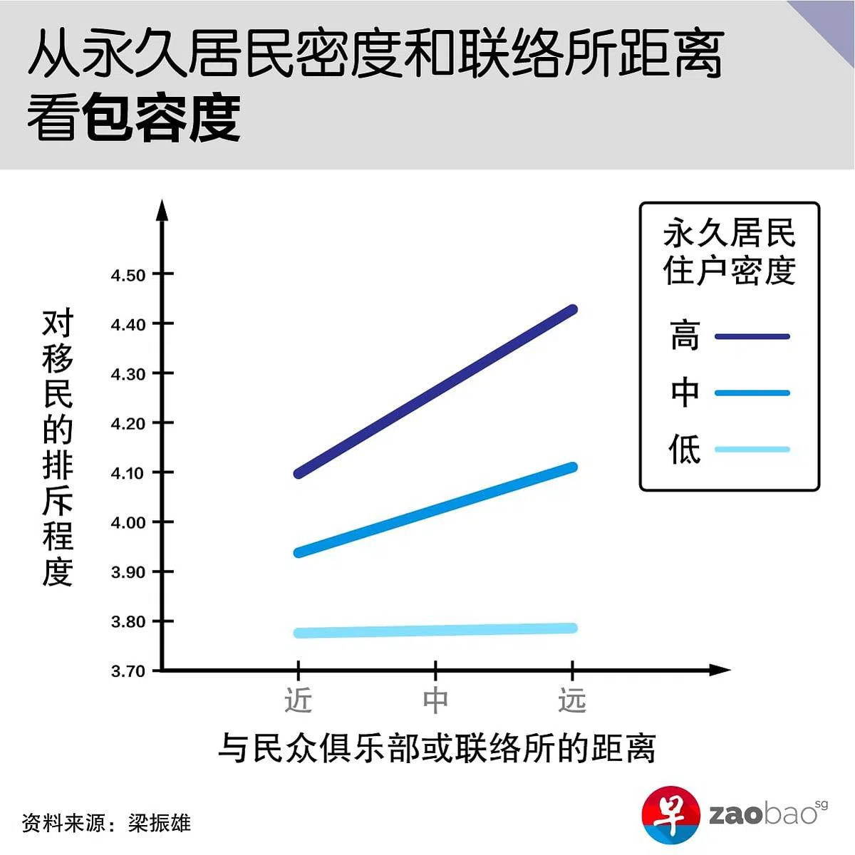 但与此同时,永久居民社群对移民的包容却较低。梁振雄指出,永久居民社群对移民相关课题的讨论相对较敏感,因为他们是当事者,他们更在意政府如何调节移民政策,担心相关讨论若往负面方向发展,恐影响他们在本地居留。也因此,永久居民住户较集中的组屋区,对移民的包容也就比较小。