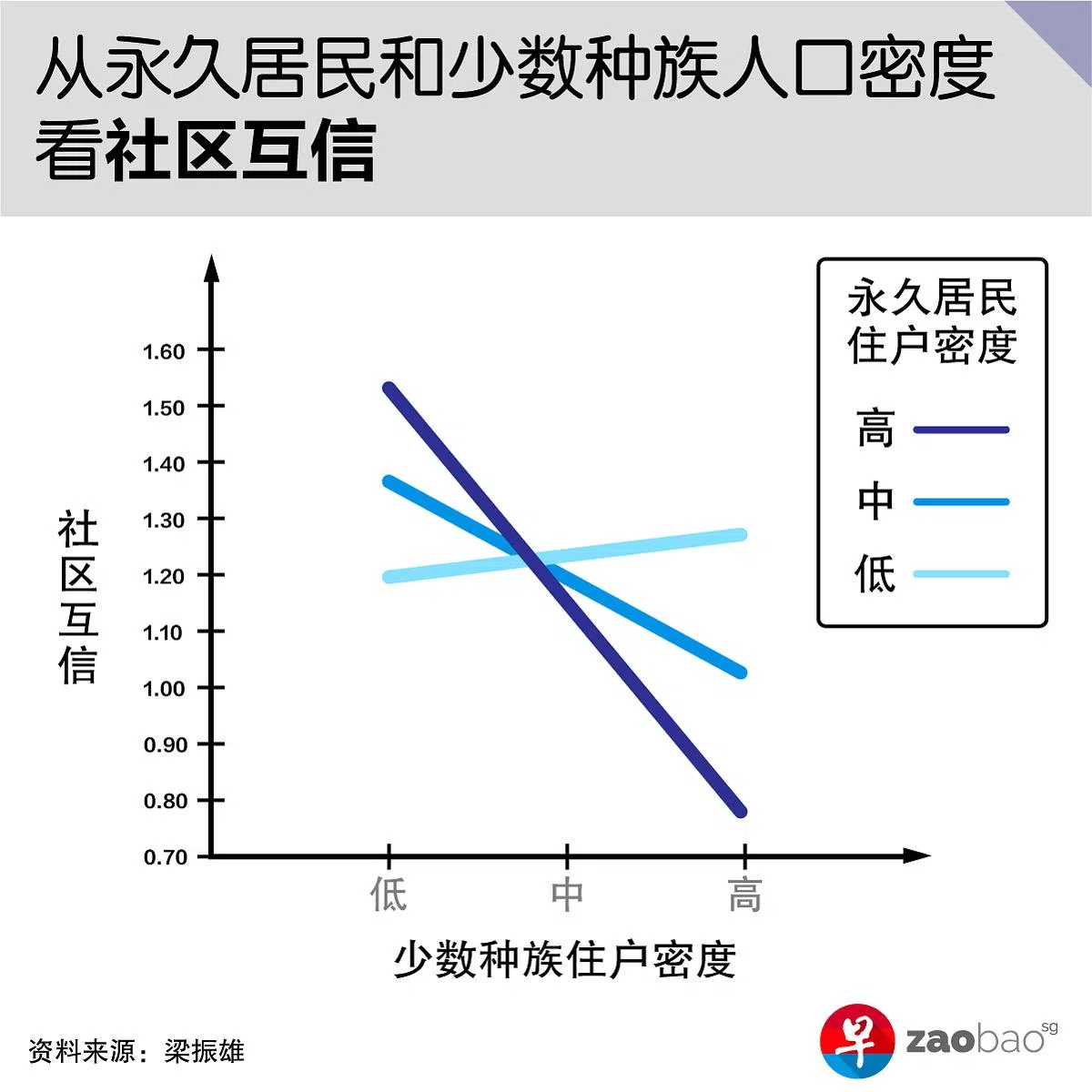 虽然永久居民社群对与其他族群交往保持开放,但当梁振雄交叉比对永久居民和少数种族两大族群的信任度数据时,他发现永久居民较集中,且少数种族人口较多的社区中,人们之间的互信相对较低。换句话说,一个组屋区的永久居民和少数种族居民越多,区内互信就越低。