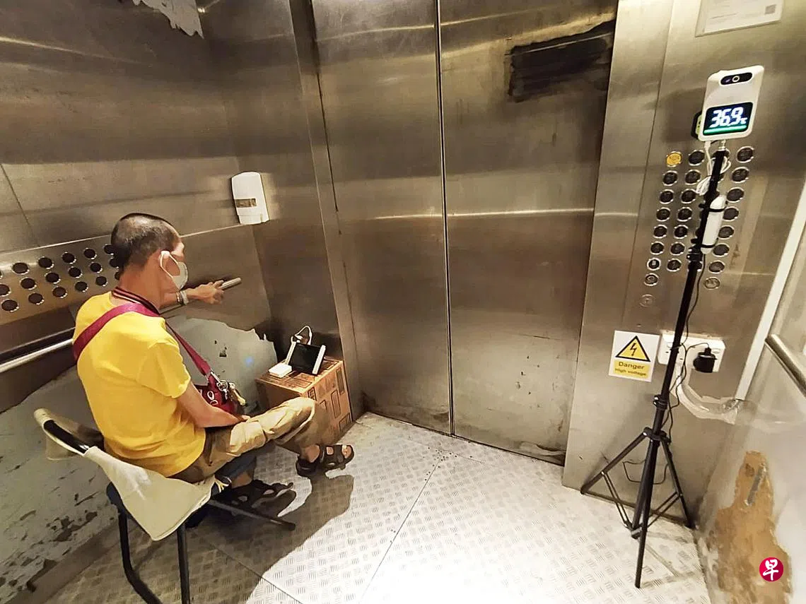 《新明日报》记者昨日(6月18日)走访时,一名60多岁员工坐在电梯内当“电梯阿叔”,负责确保进出人员测量体温以及进行SafeEntry登记,也协助乘搭电梯者按电梯。据观察,电梯内贴有SafeEntry的QR码,也有告示说明在高警戒解封第二阶段间,使用货运电梯的送货员,必须测量体温与SafeEntry登记。