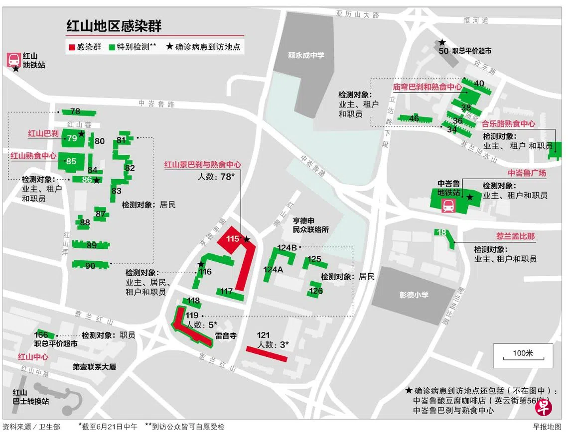 红山景第115座巴刹与熟食中心本月13日被列为感染群,截至前天累计78起病例,附近的第119座和第121座组屋也于前天出现两个新感染群。