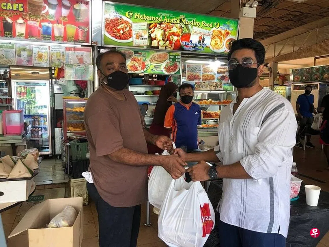 为了帮助受疫情影响,但又不会使用网上服务的小贩中心摊主,本地音乐人沙比尔(Shabir Tabare Alam,36岁,右)突发奇想,将富有本地文化的小贩食物带给住在宿舍里的客工。既能给小贩带来生意,也能让客工享用不一样的美食,并进一步了解我国文化。