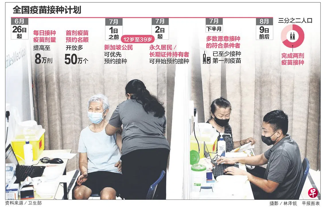 联合领导抗疫跨部门工作小组的王乙康、黄循财和贸工部长颜金勇昨天在联名发表的文章中阐明接种计划的两个目标,即到了7月初,让三分之二的本地居民至少接种第一剂疫苗;在国庆日前后,让至少三分之二的居民完成两剂接种。