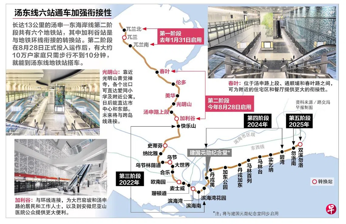 汤东线第二阶段分别有春叶、伦多、美华、光明山、汤申上段和加利谷站。这六个地铁站将于8月28日正式通车。