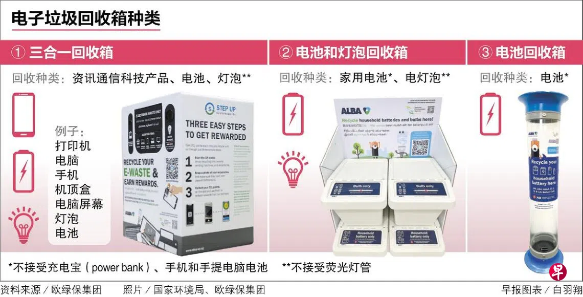 国家环境局和业者上个月起陆续在九个地点放置电子垃圾回收箱,过去一个月收集了超过1公吨的废弃产品,最常被丢弃的包括打印机、手机、电脑和灯泡。