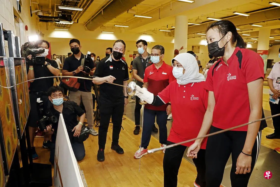 哈莉玛总统(右二)昨天上午在文化、社区及青年部长兼律政部第二部长唐振辉(右三)的陪同下,前往华侨银行室内体育馆探访正积极备战奥运的本地击剑运动员可丽雅(右一),以及羽毛球选手骆建佑、杨佳敏。