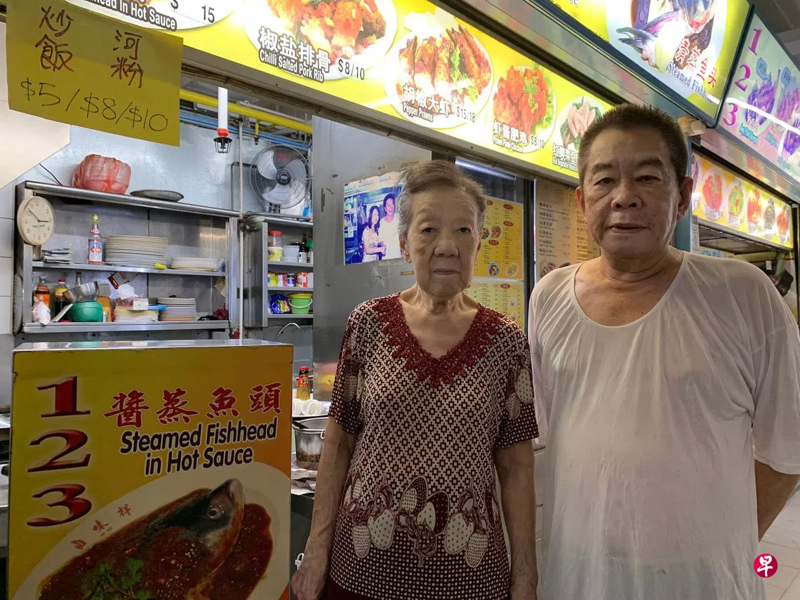 走进全国最大的小贩中心牛车水大厦,恰逢每个季度的大清洗,周围冷清异常。走了一圈,好不容易看到姐弟拍档梁银燕(76岁)和梁桎晟(68岁)隔着半掩的铁闸门,清洗和整理位于角落头煮炒店内的设备。