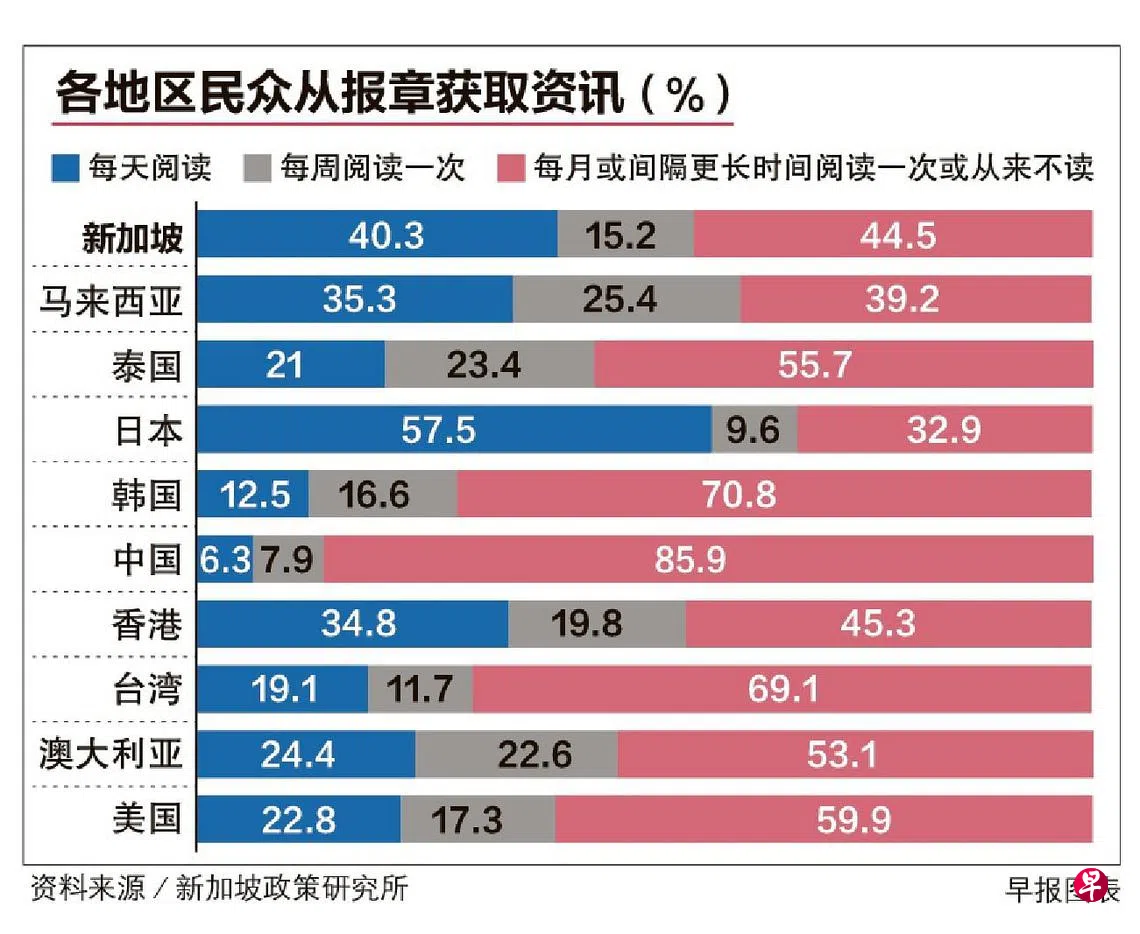 研究也显示,有15.2%居民习惯每周阅读报章一次,44.5%则是每个月或间隔更长时间才阅读报章,或完全没有读过。