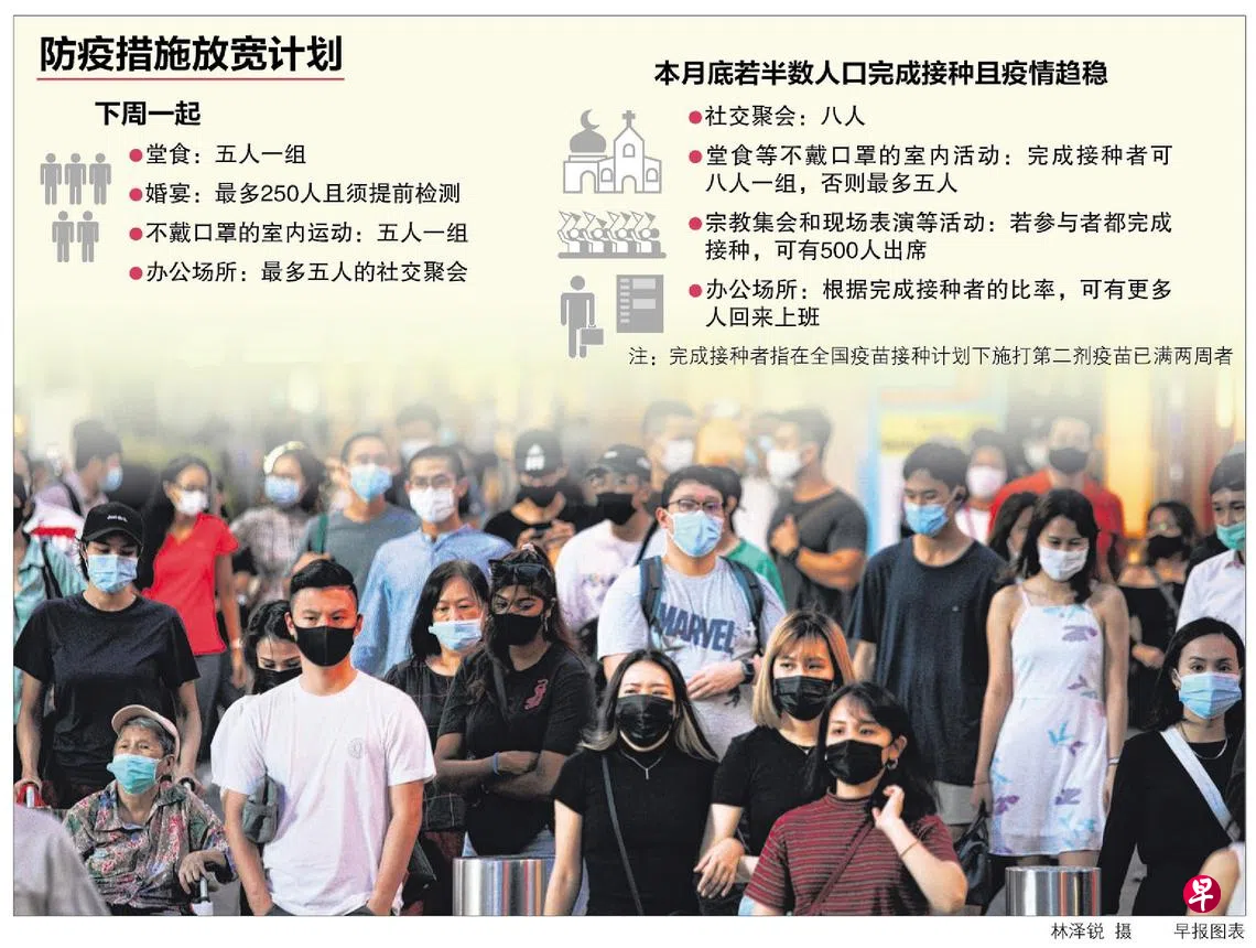 我国将从下周一起允许五人一组的堂食和不戴口罩的室内运动,办公场所也可恢复最多五人的社交聚会。若冠病疫情保持稳定,到了7月底有至少一半人口接种,政府届时将会考虑让完成疫苗接种者参加八人一组的堂食和社交聚会,以及出席多达500人的特定大型活动。