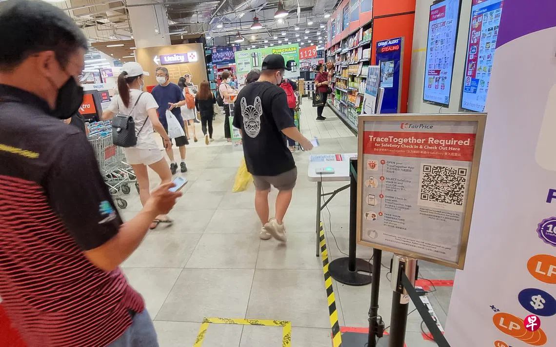 本月21日起,购物商场内的超市将恢复实施SafeEntry访客登记。公众即使在商场入口已登记,进入超市前仍须使用“合力追踪”应用或携手防疫器再登记一次。