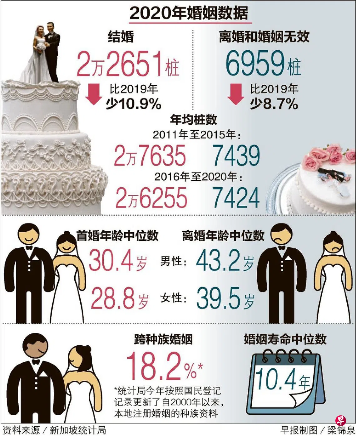根据新加坡统计局昨天发布的数据,去年有2万2651对新人注册结婚,2019年则有2万5434对,跌幅为10.9%。这是结婚桩数自2018年连续三年下滑,跌幅也是2000年以来最大的。