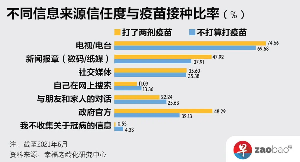 从哪些渠道获取接种疫苗的信息?这些信息是否可靠?这都会影响人们对接种疫苗的判断和意愿。研究发现,打了两剂疫苗的人和不愿接种疫苗的人获取信息的方式略有不同。从上图可见,不愿接种者对各大媒体、政府官方信息的信任度都偏低,更倾向于自己上网搜索,甚至有4.33%的人完全不想去了解冠病疫苗。报告指出,若能鼓励他们身边的家人、朋友把正确的疫苗信息传达给他们,这或许有助于说服他们对疫苗改观。