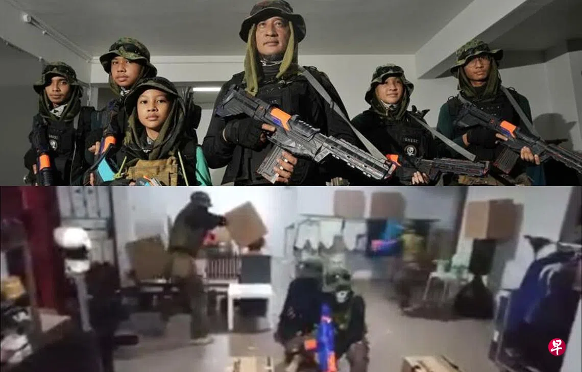 《联合晚报》报道,网上前天流传一则44秒的视频,显示某栋组屋的电梯口摆放了各种高低不一的纸箱,四人全副武装戴上军绿色帽子、穿着迷彩色长裤和“防弹衣”,还背着“枪”,时而蹲上时而蹲下,躲在纸箱后,对着假想敌“开枪”,犹如迷你战场。