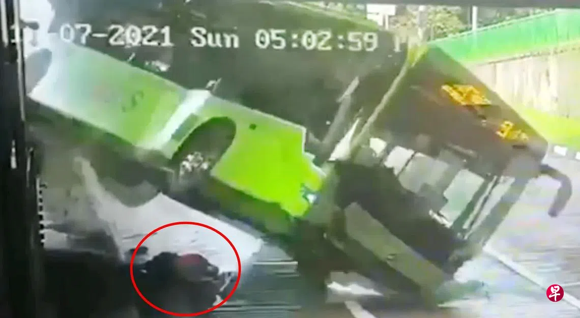 武吉巴督巴士转换站车祸经过的视频昨天曝光,显示绿色栏杆首先被撞飞,新捷运巴士车长整个人被重重抛落在栏杆旁,载着乘客的巴士车头随即往下坠落,整辆巴士越过新捷运车长上方约一两秒,所幸他命大没被压中。