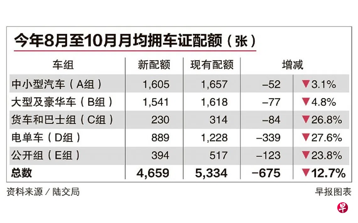 陆路交通管理局昨天公布今年8月至10月的拥车证配额数量,下来可供投标的拥车证配额整体减少约12.7%,共计1万3984张,每月平均只有4659张。