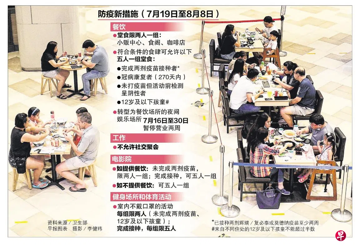 社区病例再次激增,政府将更具针对性地收紧防疫措施。下周一(19日)起,堂食人数将倒回到不超过两人一组。