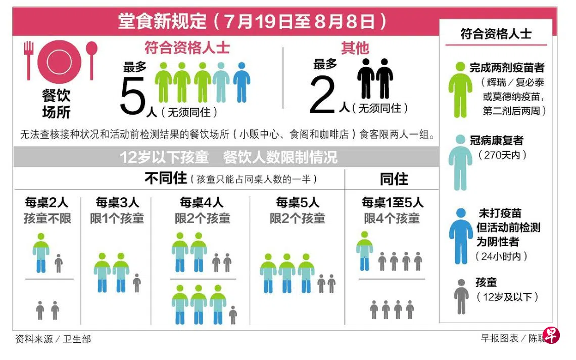 不过,已完成接种辉瑞/复必泰(Comirnaty)或莫德纳疫苗至少两周的人、已康复的冠病患者、持有效的阴性活动前检测结果,和12岁及以下的孩童到餐馆时,能继续按最多五人一组堂食。餐馆必须确保这些食客能出示相关证明。
