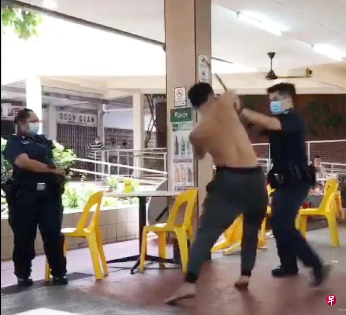 这起闹剧发生在昨天(7月16日)下午1时49分许,地点是法兰西路(French Road)第802座组屋的咖啡店。网上昨日疯传多段视频,一名文身男打着赤膊在咖啡店大闹,情绪激动地冲向警员,挥拳飞腿,警员手握警棍对阵,僵持了近一分钟。