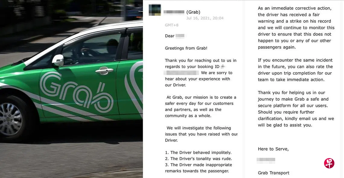 乔琳过后在Grab手机应给司机打分一颗星后,也向私召车公司反映。事后,一名Grab负责人两度致电给她,向她了解情况并道歉,并指已经将该司机的行为记录在案并给予警告。
