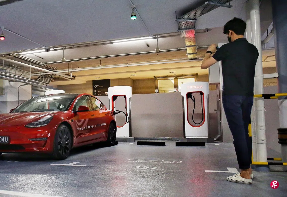 电动车15分钟可蓄满电力 特斯拉在乌节中央城设三超级充电点订户赠阅文章特斯拉在中央城商场九楼停车场设三个V3超级充电点,最快可在15分钟为电动车完成充电,不过只供特斯拉车主使用。(白艳琳摄)特斯拉是通过陆路交通管理局新推出的监管沙盒,获准在本地安装这些充电设备。特斯拉也计划下来几个月在本地更多地点设更多超级充电站。李思敏 报道leesimin@sph.com.sg上一篇供应虽减少 海鲜熟食摊贩暂不考虑涨价下一篇部分胜科环卫垃圾及回收卡车电动化购买此文章