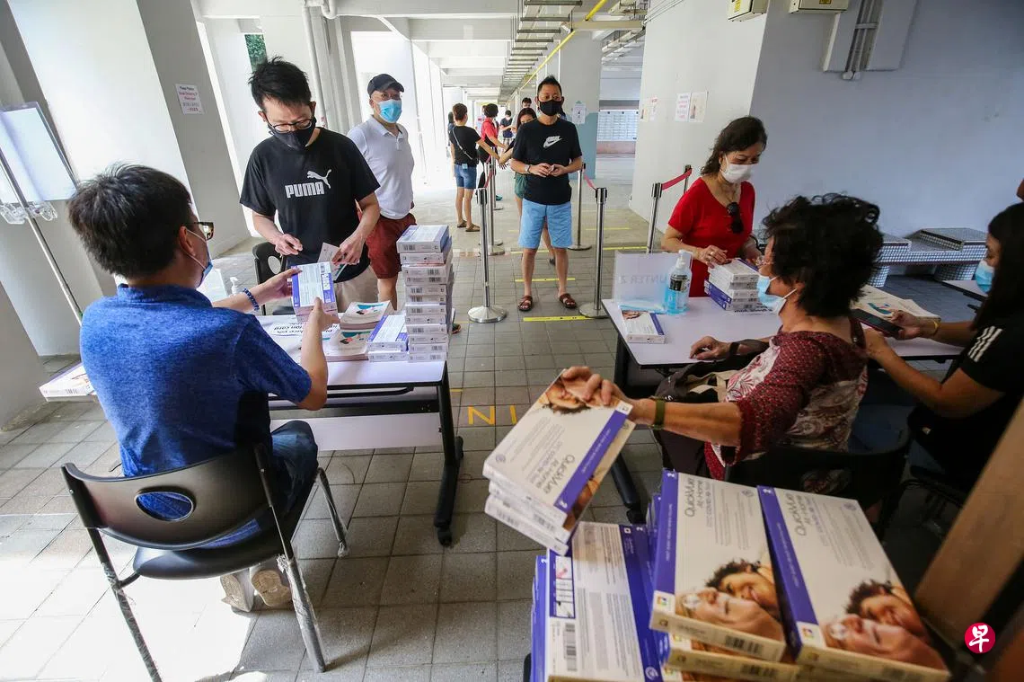 宏茂桥居民昨天到宏茂桥10道第483座组屋楼下领取抗原检测仪,方便在家自行检测是否感染冠病。