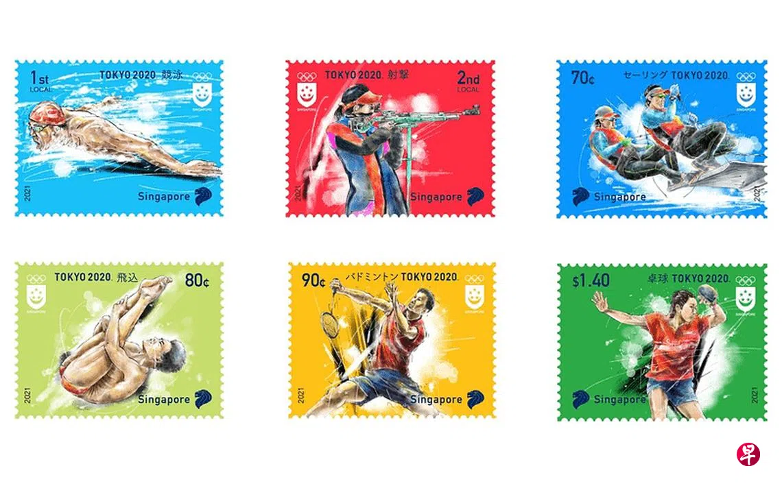 新邮政上星期五发行一套东京奥运会的纪念邮票。纪念邮票共有六款设计,分别展现新加坡运动员即将参赛的部分项目,包括游泳、射击、帆船、跳水、羽毛球和乒乓球。虽然奥运会延迟至今年举行,但官方名称仍保留“Tokyo 2020”。