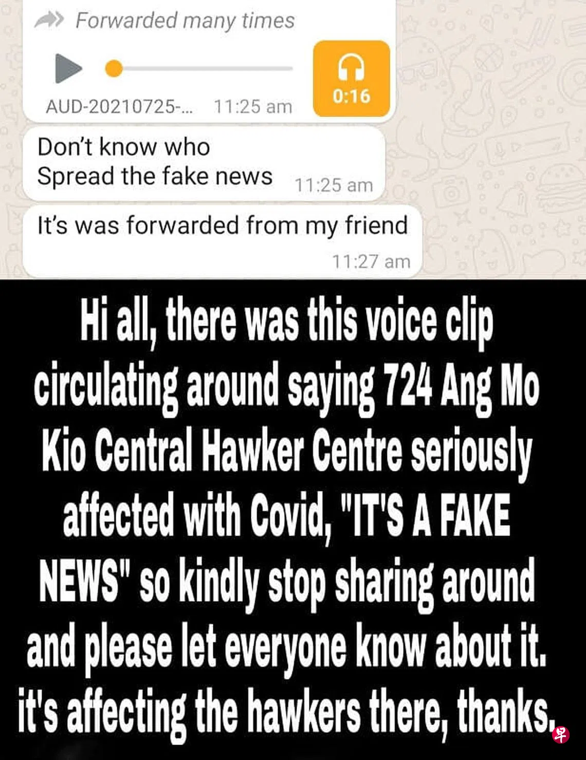 谣言再起!三条虚假音频疯传,称到过宏茂桥中心巴刹与熟食中心的民众将被隔离60天,而且宏茂桥地铁站不开。小贩中心理事会主席出面辟谣:太荒谬!
