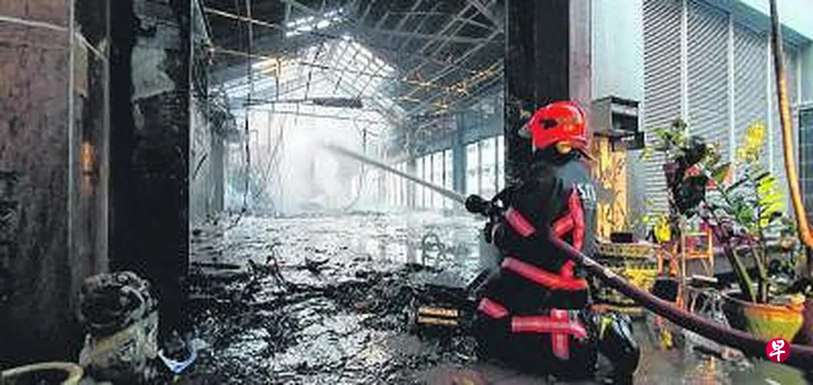 民防人员进入失火单位灭火时,屋顶砖瓦片片掉落,险象环生,当局前后花了一小时才将大火扑灭。