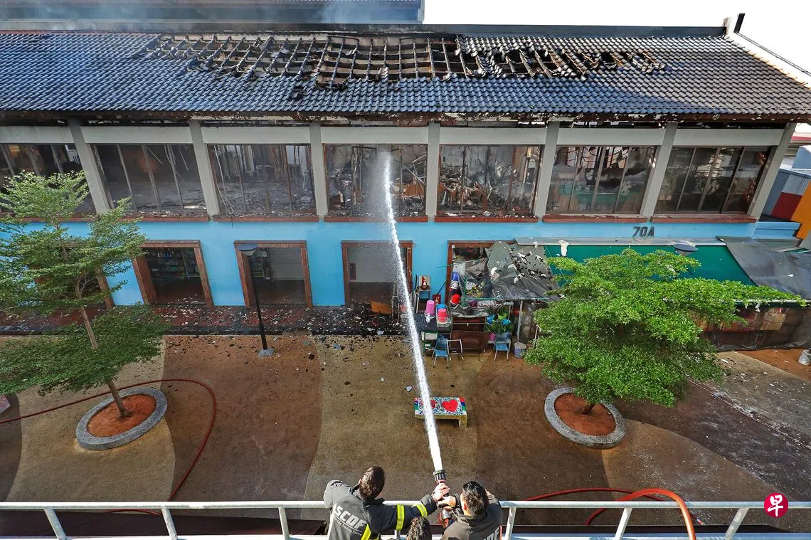 芽笼峇鲁昨日清晨发生大火,火势相信从二楼舞蹈室开始蔓延,烈焰烧穿屋顶,现场传出玻璃爆裂的声响。民防部队出动40名消防员和11辆消防车,一小时内将火势扑灭,无人在意外中受伤。
