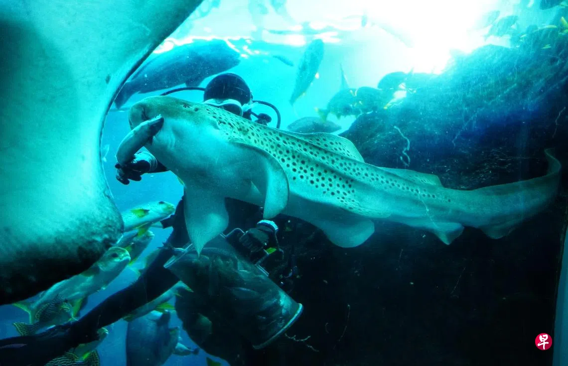 国庆日将至,圣淘沙名胜世界的S.E.A海洋馆双喜临门,除了庆祝斑马鲨Vanda(图右)的五岁生日,七个月大的斑马鲨宝宝Hope也首次亮相,与公众一起欢庆国庆。Vanda是海洋馆的奇迹宝宝,相信是通过单性生殖(Parthenogenesis)孵化,在五年前的8月9日出生。斑马鲨是濒临绝种的稀有海洋动物。由于馆内近年没有雄性斑马鲨,饲养员在发现鲨鱼卵孵化时非常惊喜。饲养员也不排除雌性斑马鲨将雄性斑马鲨的精子长时间储存在体内,并在产卵后进行受精,以繁殖后代。除了Vanda,今年1月出生的斑马鲨宝宝Hope也同样是通过单性生殖孵化。为了庆祝Vanda的生日,饲养员特意为它制作冰冻蛋糕,里面有各种它爱吃的食物。(何家俊摄)