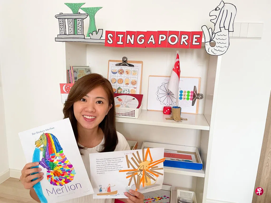 为鱼尾狮贴上色彩缤纷的鱼鳞、拼出本地著名旅游景点的拼图,育有三名孩子的教育网站创办人设计出国庆主题活动包,希望通过互动的教育活动和游戏,提高孩子对新加坡的认识,培养他们的爱国精神。