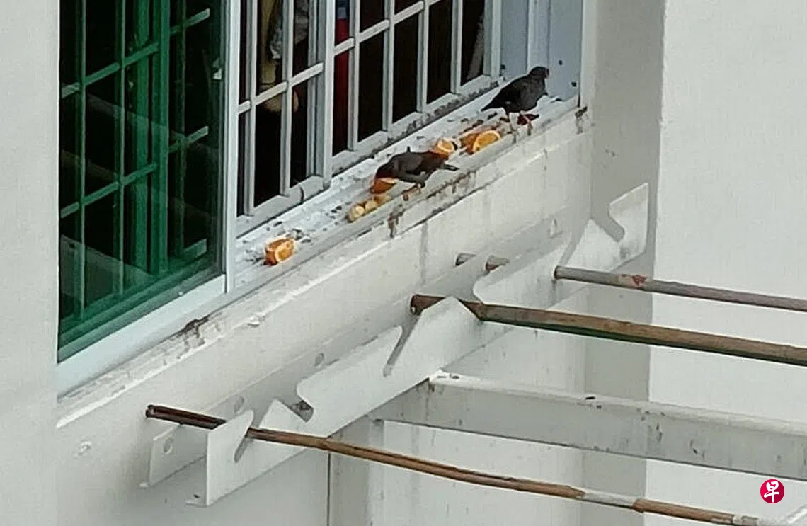 热心读者王先生(67岁,德士司机)拨打24小时新闻热线投报,申诉义顺环路第167座组屋8楼一户邻居天天将苹果、橙以及面包等食物放在窗台旁,引来八哥前来觅食。