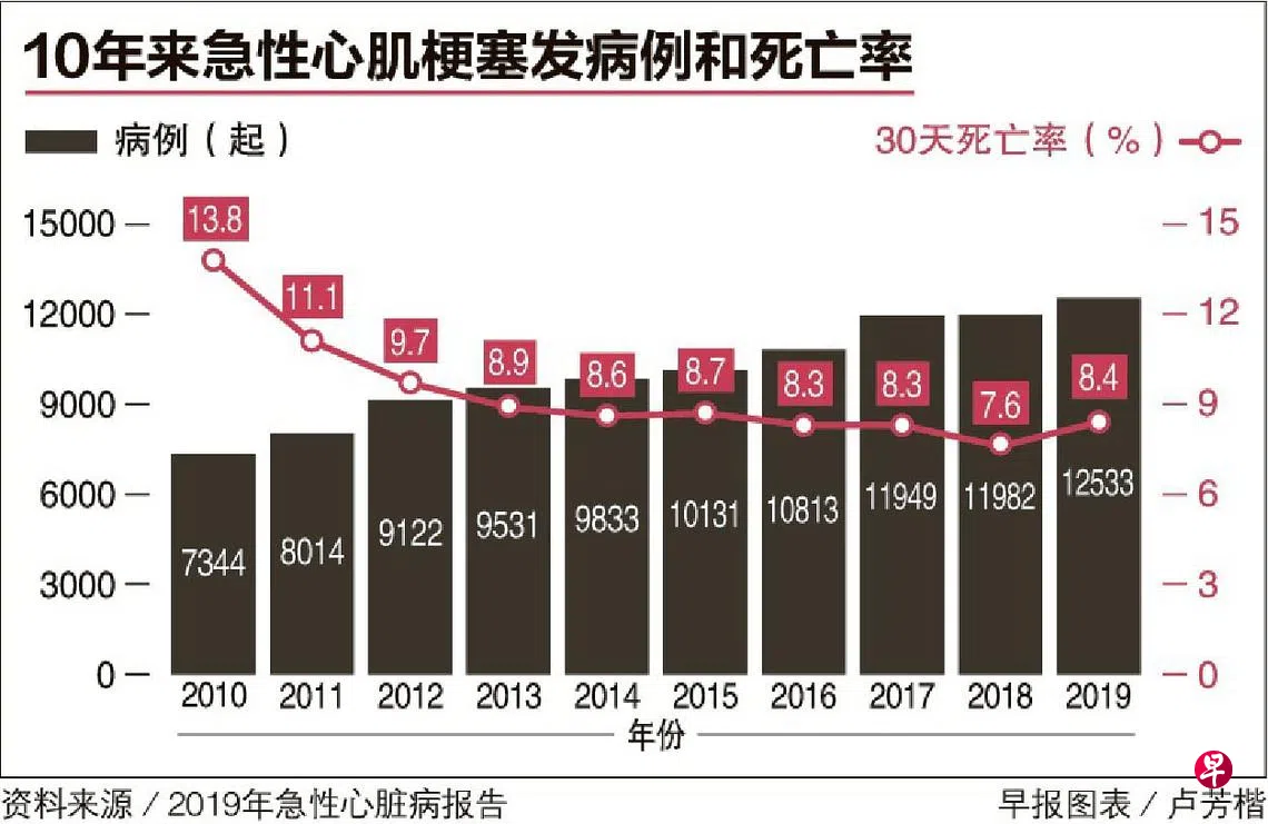 急性心脏病发病个案在10年里激增超过七成,但由于急救和医疗措施明显改善,病发后30天内的死亡率从13.8%显著下降至8.4%。