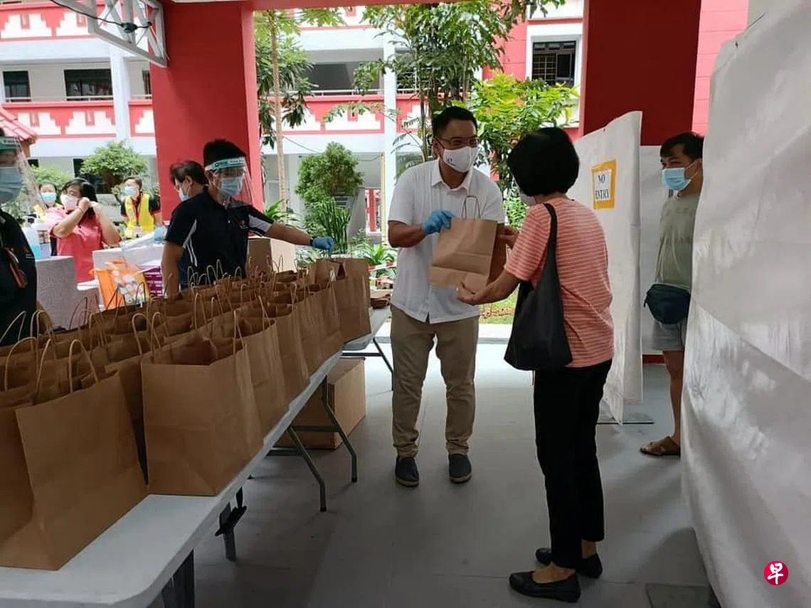 该组屋位于先驱区,议员郑德源昨早到组屋底层的检测站,并与基层义工一起为居民派发自助检测仪。