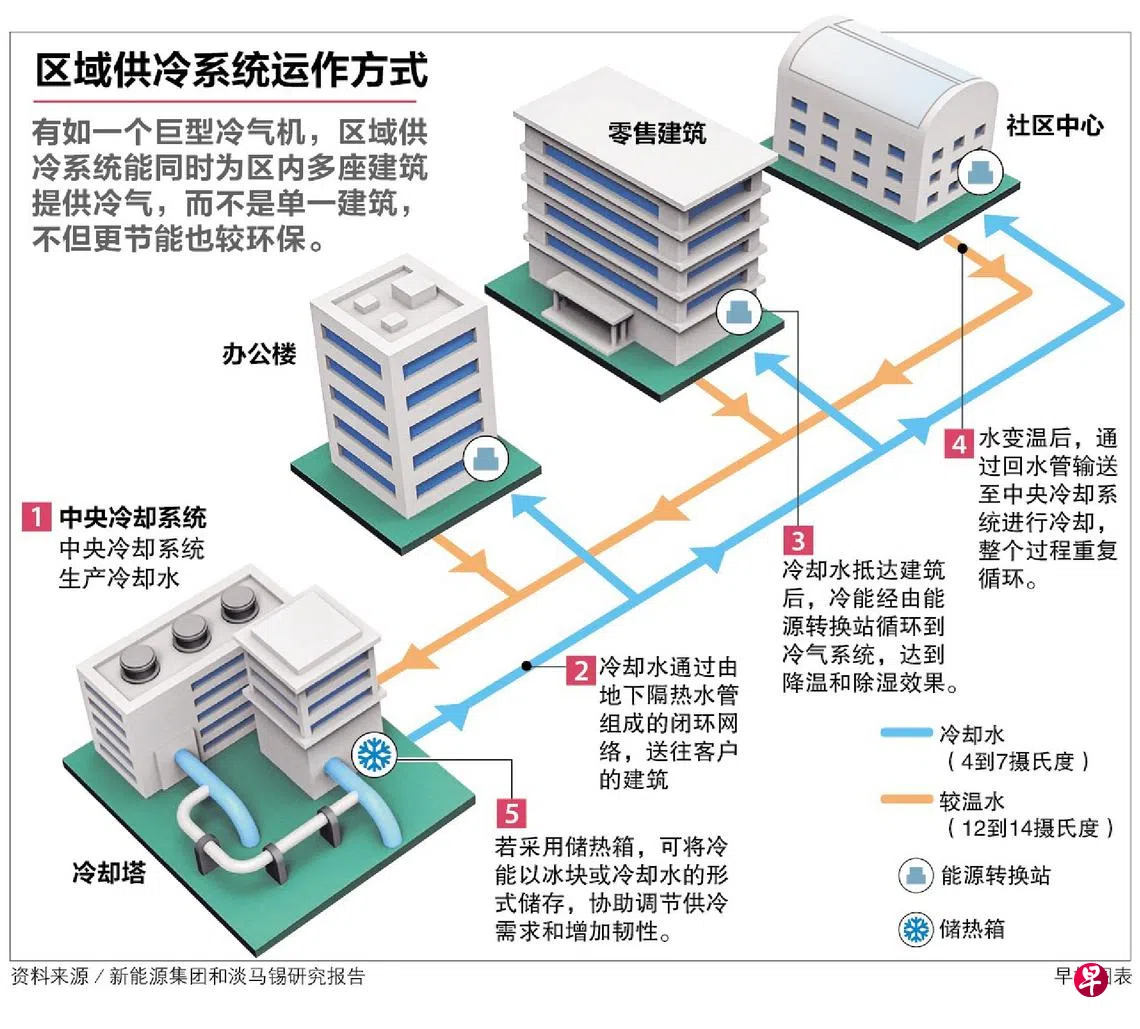 新能源集团和淡马锡的研究报告显示,使用分布式区域供冷网络,除了能降低用电量,更可能减低多达18%的碳排放量,约等于公路上每年少了2250辆汽车。