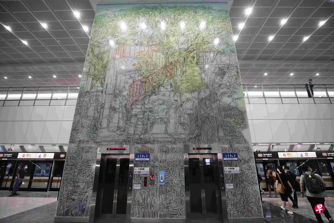 将书法点字榕树等融入设计 汤东线六地铁站带公众踏上艺术之旅订户赠阅文章春叶站月台这幅漫画家许丰定的作品,以春叶自然公园的一棵老榕树为主角,周围画满了古色古香的店屋、美食和怀旧物品。(蔡家增摄)本地六名艺术家参与陆路交通管理局的“艺术之旅”计划,根据汤东线第二阶段六个地铁站周围环境的特色创作艺术作品。李思敏 报道leesimin@sph.com.sg上一篇从2023年起六年内 园艺业员工每年最低工资平均增6.3%下一篇身为“青年自然管家” 为保护大自然生态出力购买此文章