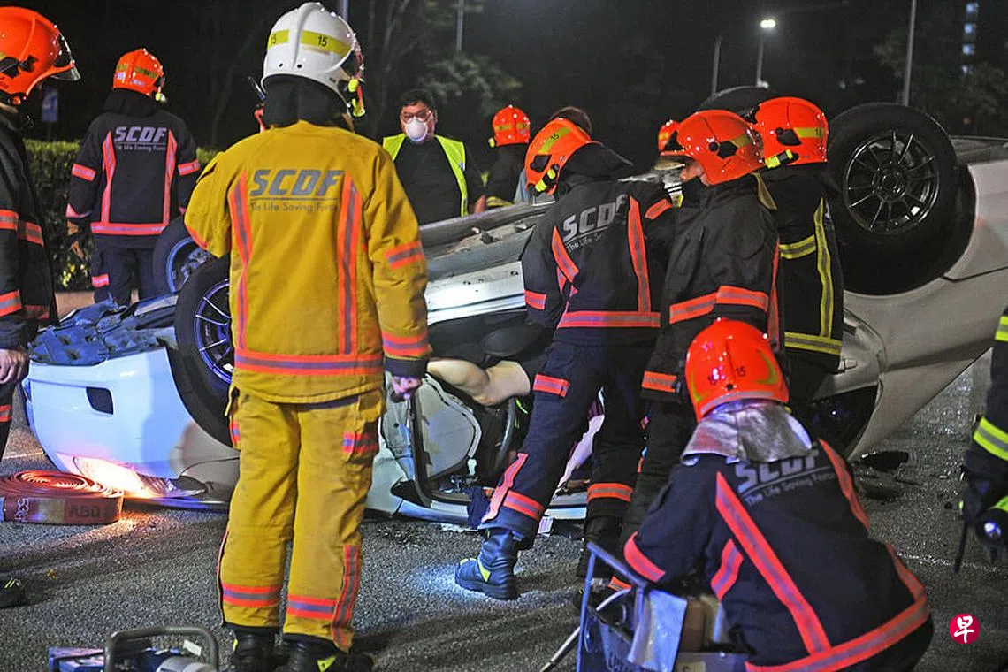 布莱德路前晚发生一起惊险车祸,一辆白色轿车从新加坡报业中心驶出大路后,不知何故被尾随而来的黑色汽车猛撞而翻转,女驾驶受困在四轮朝天的车内动弹不得,民防人员到场花了30分钟救人,黑色汽车男驾驶因涉嫌酒驾被捕。