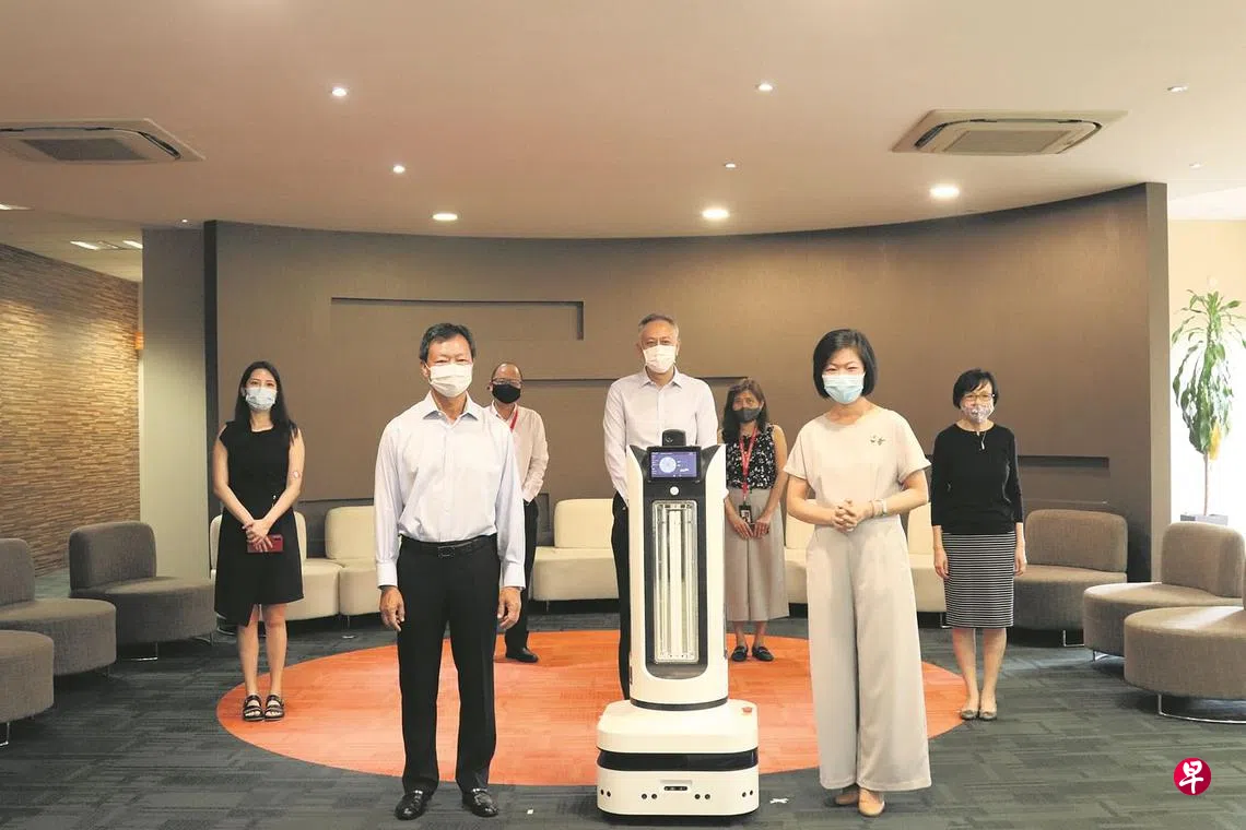 继6月份为四所小学及两个民众俱乐部捐赠21万个儿童手术口罩后,新加坡九龙会为协助学校抗疫,捐赠了一台紫外线消毒机器人给义安理工学院。