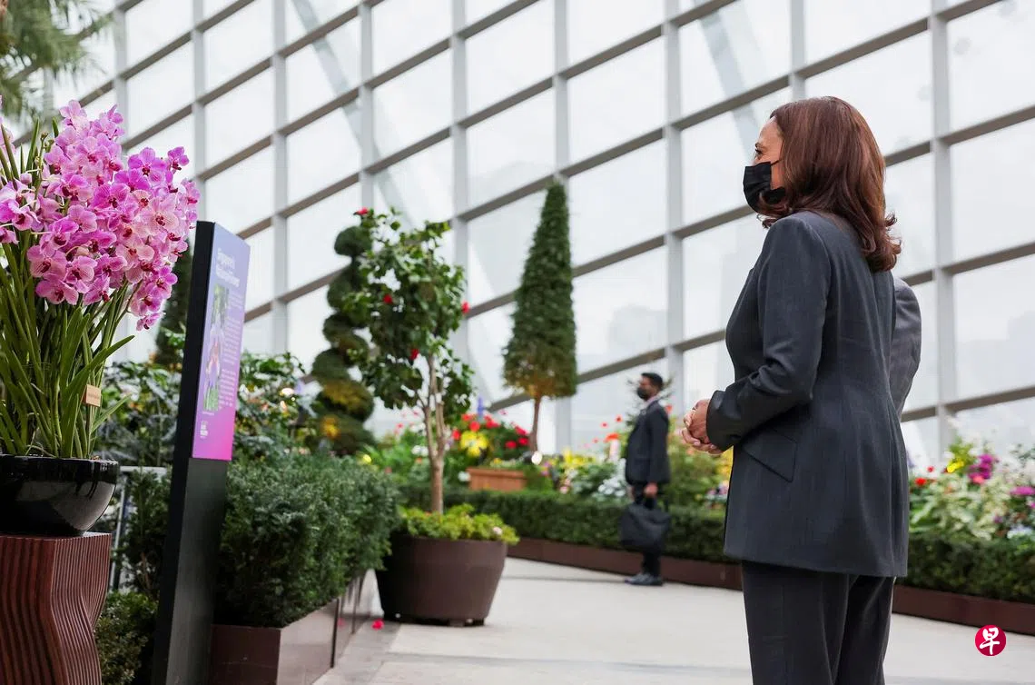 哈里斯昨早在滨海湾花园发表演讲后,与贸工部长颜金勇及本地商界代表举行圆桌讨论会。她也参观了滨海湾花园,包括在花穹观赏以她名字命名的胡姬花。