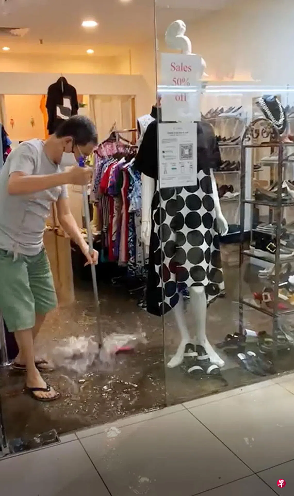 事故发生在昨早大约10点左右,商场外头正下着大雨,商场门口的沟渠无法及时排掉雨水,导致大量雨水涌出沟渠流入商场,并从一楼顺势流到地下层一楼。