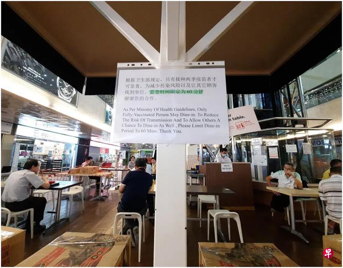 他后来注意到,食阁内确实有张贴数张告示,上面写着“为减少传染风险以及让其他顾客找到座位,堂食时间限定为60分钟。”