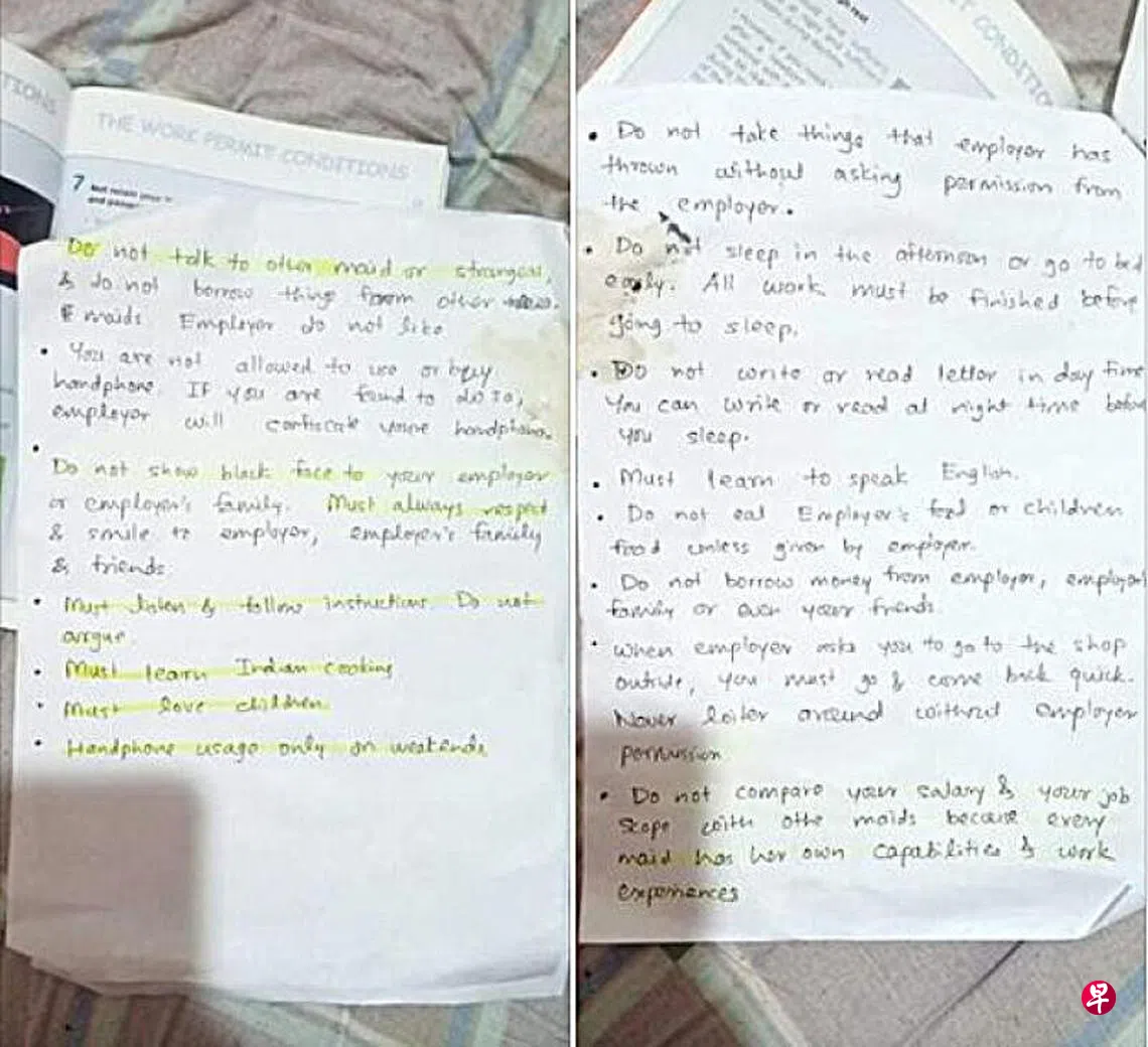 客工援助组织“情义之家”(HOME)义工宾娜瓦托(48岁,女佣)日前在网上揭露,有雇主写出两页纸张共16条规则的“清单”,包括只有在周末才可致电回家,还称这些都是人力部条例。