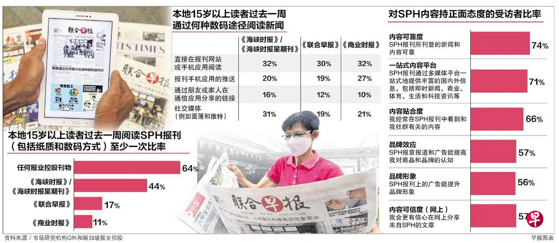市场研究机构GfK的最新调查发现,73%年龄超过15岁的本地人口每周都会阅读至少一种由新加坡报业控股(SPH)发行的刊物,包括纸质报章、杂志和数码产品等。其中,每周阅读《联合早报》的人口比率为17%。