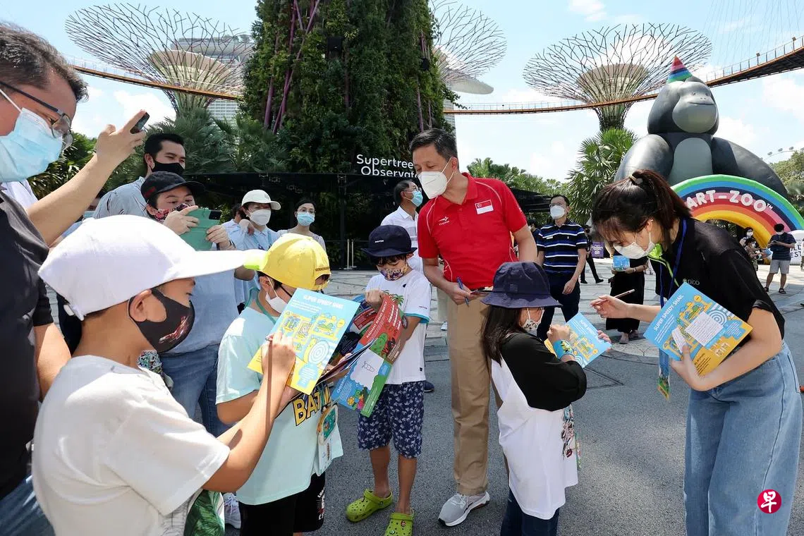 滨海湾花园儿童节去年因疫情暂停,今年复办后在擎天树林(Supertree Grove)呈献Art-Zoo奇幻花园,展出六个巨型动物与昆虫玩偶造型。